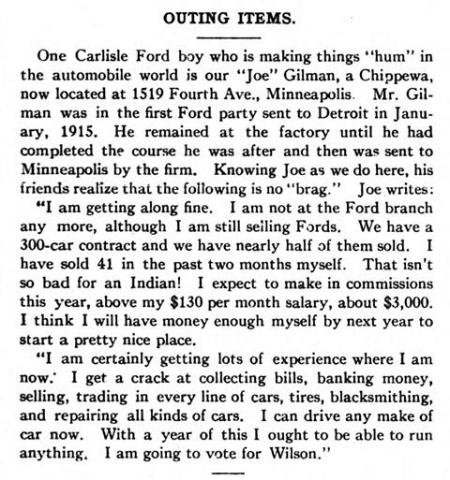 Joe Gilman was apparently transferred to Minneapolis by Ford because his daughter, Roberta Carlysle, was born there and his wife, Lydia, was from Michigan. The November 3, 1916 issue of The Carlisle Arrow contained this item about Joe: