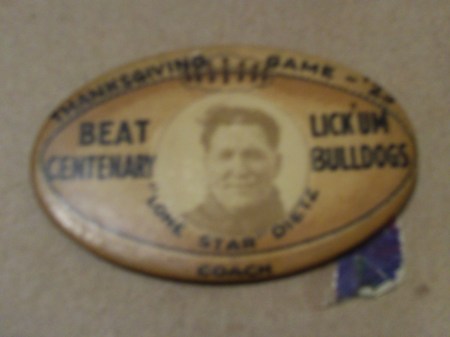 A reader submitted the photo included at the bottom of this post. I’m sorry that it isn’t clearer but this is what I was sent. I have never seen or even heard of one of these buttons before. It is purported to be a button for the 1923 Louisiana Tech-Centenary College annual Thanksgiving Day game. I can’t make out the date from the button but believe that it is authentic because Louisiana Tech played Centenary on Thanksgiving Day in 1922 and 1923, both years that Dietz coached in the Pelican State. Also, it seems unlikely that a forger would pick a relatively obscure event rather than one that would generate more interest (read a higher price). Let’s talk a little about Lone Star’s time in Ruston, Louisiana.