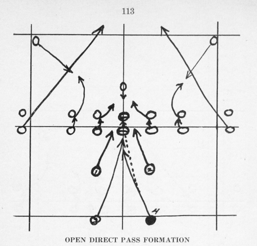 Page 113 of Pop Warner’s 1912 book, A Course in Football for Players and Coaches, begins a discussion of Warner’s Open Pass Direct Pass Formation (see bottom of this message). The diagram for this century-old offensive scheme is a bit different than the one RichRod uses but provides the foundation upon which his is based. Both offenses feature direct snaps to multiple backs as well as both pass and run plays from the same position in the formation.