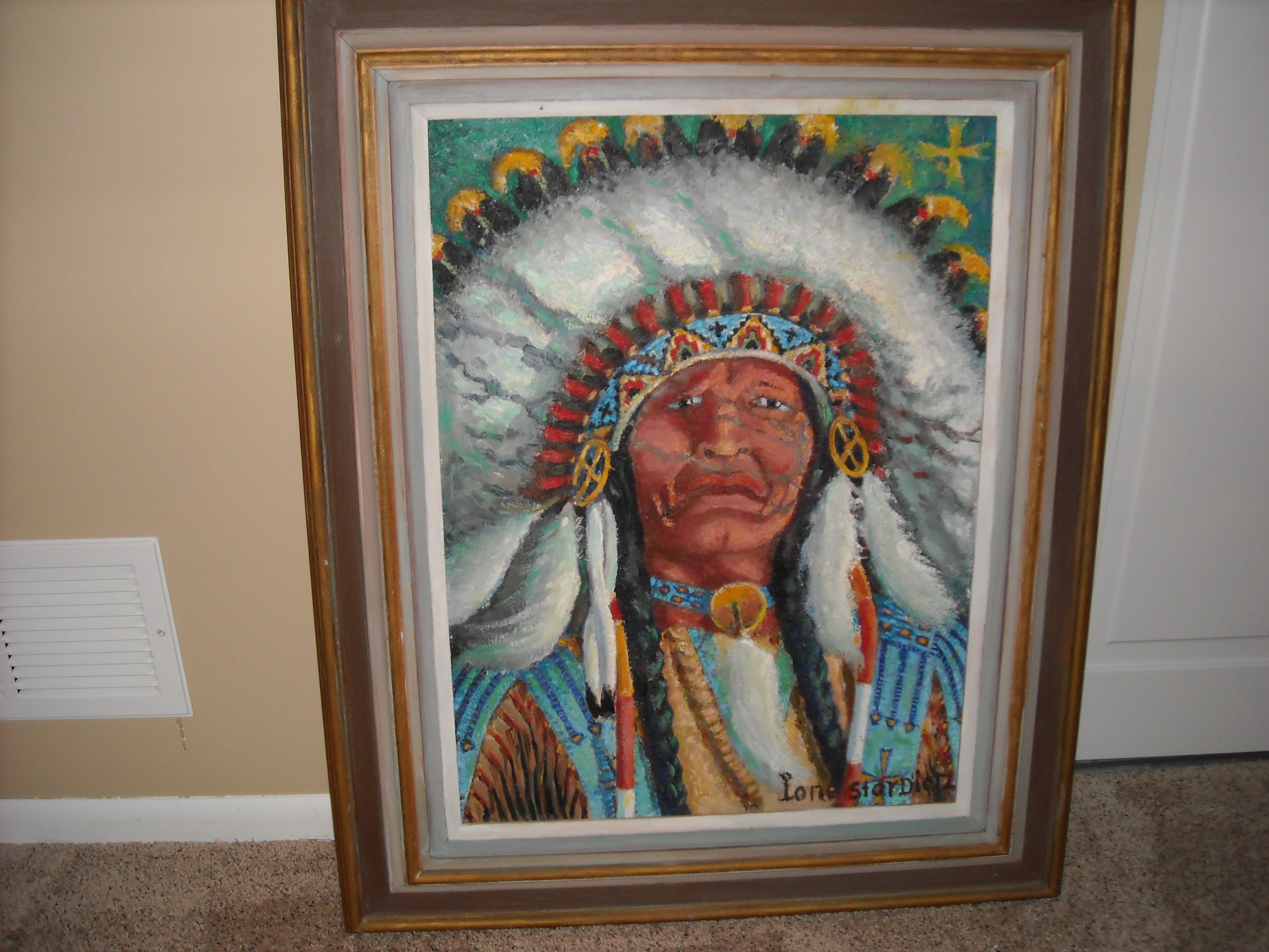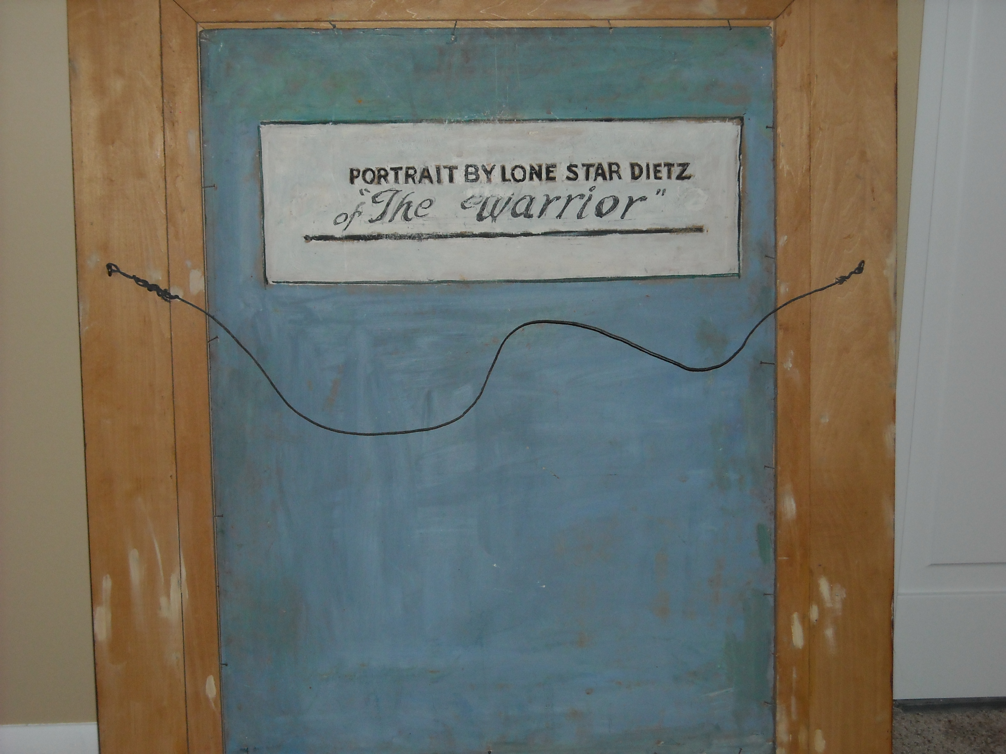 Yesterday, I received n email from the son of Mary Lou Zientek with some photos attached. Mary Lou Zientek was the woman who befriended the Lone Star Dietz and his wife, Doris, in the declining years. Mary Lou managed their estates after Doris died. Mrs. Zientek died on May 7 last year. She distributed artifacts which few valued at that time to places such as Sports Immortals in Boca Raton, Florida (they were in Pittsburgh when Dietz died). She kept a self-portrait Dietz painted in the early 1960s and, one assumes, made a gift to her for her generosity. Previously, I had only seen a black and white photo of the painting See below). Her son sent me color photos. The effect of the painting is much different in color than in black and white. Color photos of both front and back can be seen below. I thank Mr. Zientek for sharing these photos with us.
