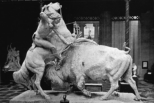 In 1892, Bush-Brown was working on a statue to exhibit at the 1893 World’s Columbian Exposition to be held in Chicago. The subject he had in mind was an Indian bison hunt. To make his statue as realistic as possible, he brought a bison and an Indian pony east to study. How he came to know Lone Wolf is unknown. At 22, Delos was a perfect physical specimen, exactly what Bush-Brown wanted for his scene. He left Carlisle for Newburgh on October 10 and returned on November 24, his work presumably done. A year later, Capt. Pratt rescinded his order against playing interscholastic football, giving Lone Wolf the opportunity to excel at that sport.