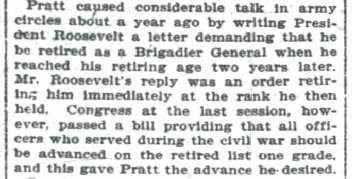A year before this article was written, Pratt wrote President Roosevelt requesting that, when he reached the retirement age of 65 two years later, he be retired as a Brigadier General. Apparently not amused by the request, the President issued an order retiring him at his then current rank of colonel, not Brigadier General.