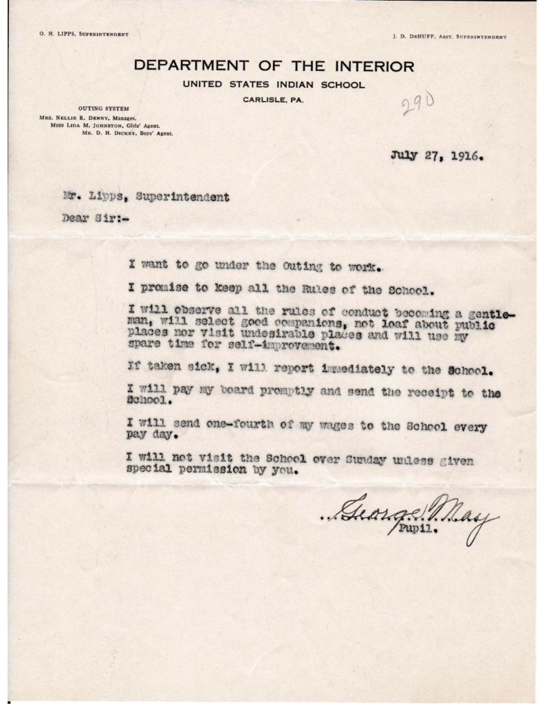 When going though George May’s student file, I came across his application to go out on an outing over the 1916 summer. The Carlisle outing program has been severely criticized in recent years, unfairly in some instances. For starters, students had to apply for the outing program and the school’s administration had to approve it before the student was allowed to go. Younger students weren’t allowed to go for obvious reasons.