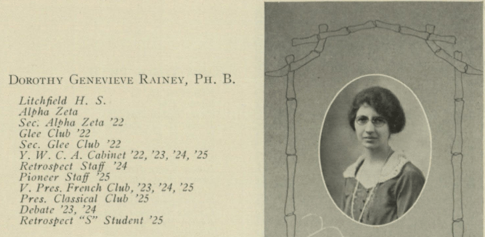 SIUE has digitized the Shurtleff College yearbooks and has made them available to peruse on-line. Miss Rainey’s senior page accompanies this piece. She was quite active at Shurtleff, particularly with the French club. One of the nice things about high school and college yearbooks of this period is that they are gossipy. A few interesting quips about her follow: