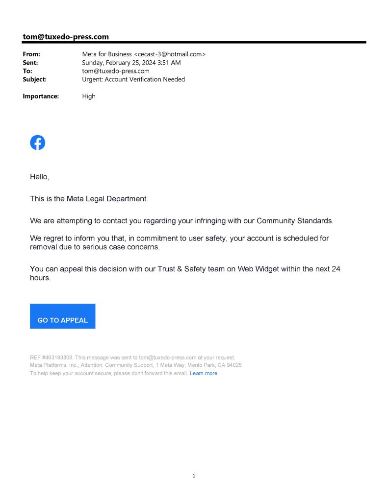 The day after posting the ID.me message, I received one from Meta for Business threatening to remove my account “due to serious case concerns.” I found that odd since Facebook, the evil spawn of Meta, had canceled me back in October. They (it?) gave me 24 hours to appeal their decision and provided a bright blue button to click to initiate the appeal. Skeptical by now, I doubted the sincerity of the message. A quick scan of the message header solidified my opinion. Why would a Meta (or Facebook) employee send me an “official” message from a Hotmail account?
