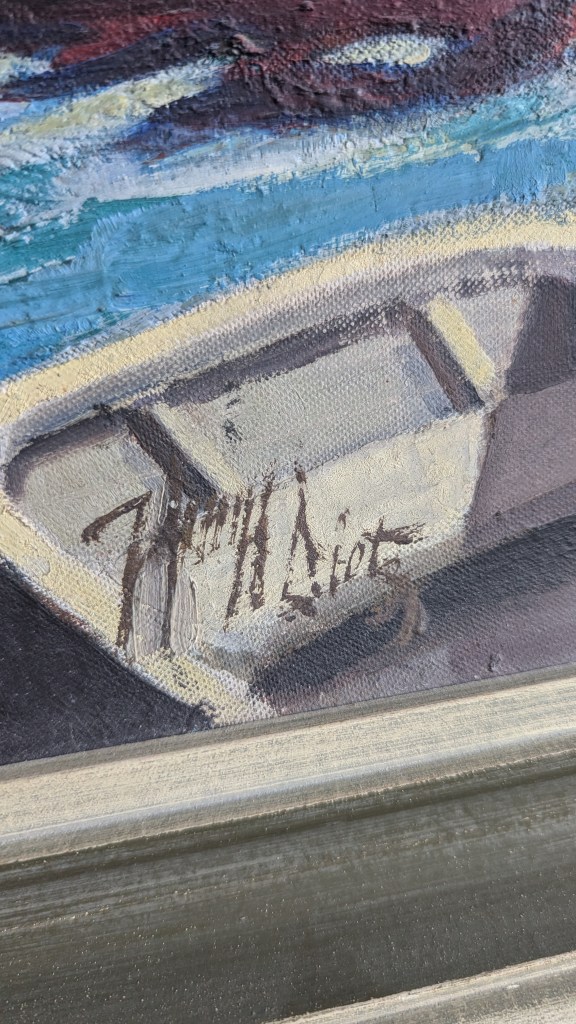I bought a painting titled “Vacation Land” some years ago. The work, also painted on canvas board, seems similar enough that it might have been painted by the same person. It is signed “William Dietz.” On the back below the title of the painting is “by Wm H Dietz.” His birth certificate, recorded five years after his birth, gives his name as William Henry Dietz. He signed the painting one way and put his name on the back another way. This inconsistency is not unexpected.